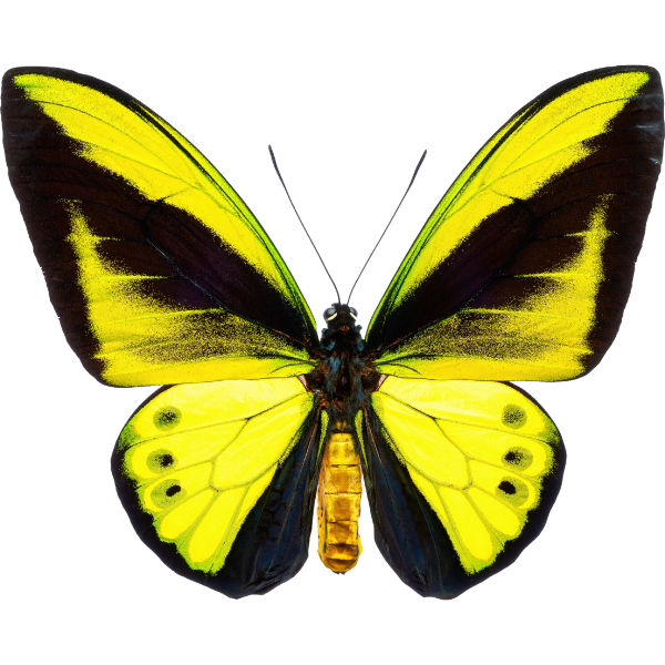 Der zweitgrößte Tagfalter der Welt. Das Männchen hat eine leuchtend grüne und gelbe Zeichnung auf schwarzem Grund. Er bewohnt die Regenwälder Neuguineas.